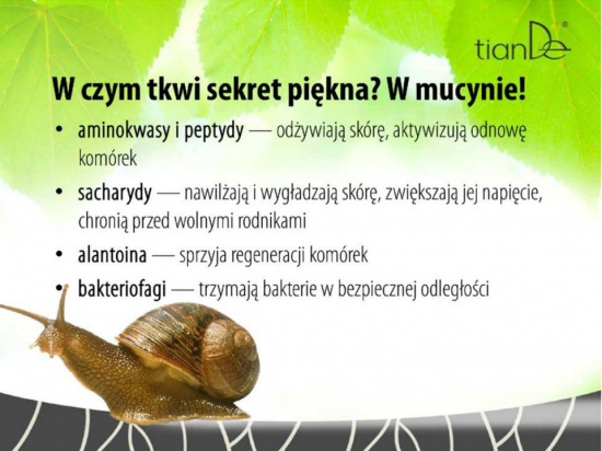Podstawę maski stanowi mucyna (śluz) ślimaka, która zawiera dużą ilość wartościowych komponentów kosmetycznych.